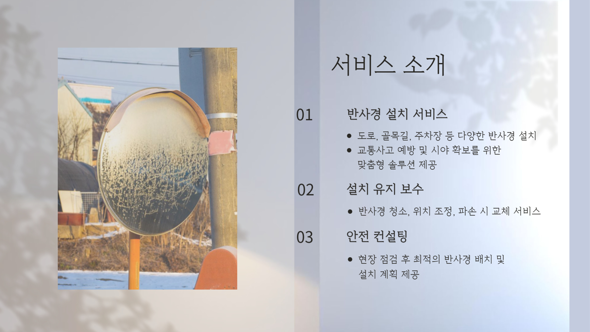 반사경 청소, 위치 조정, 파손 시 교체 등 지속적인 관리 서비스로 안전을 유지합니다.