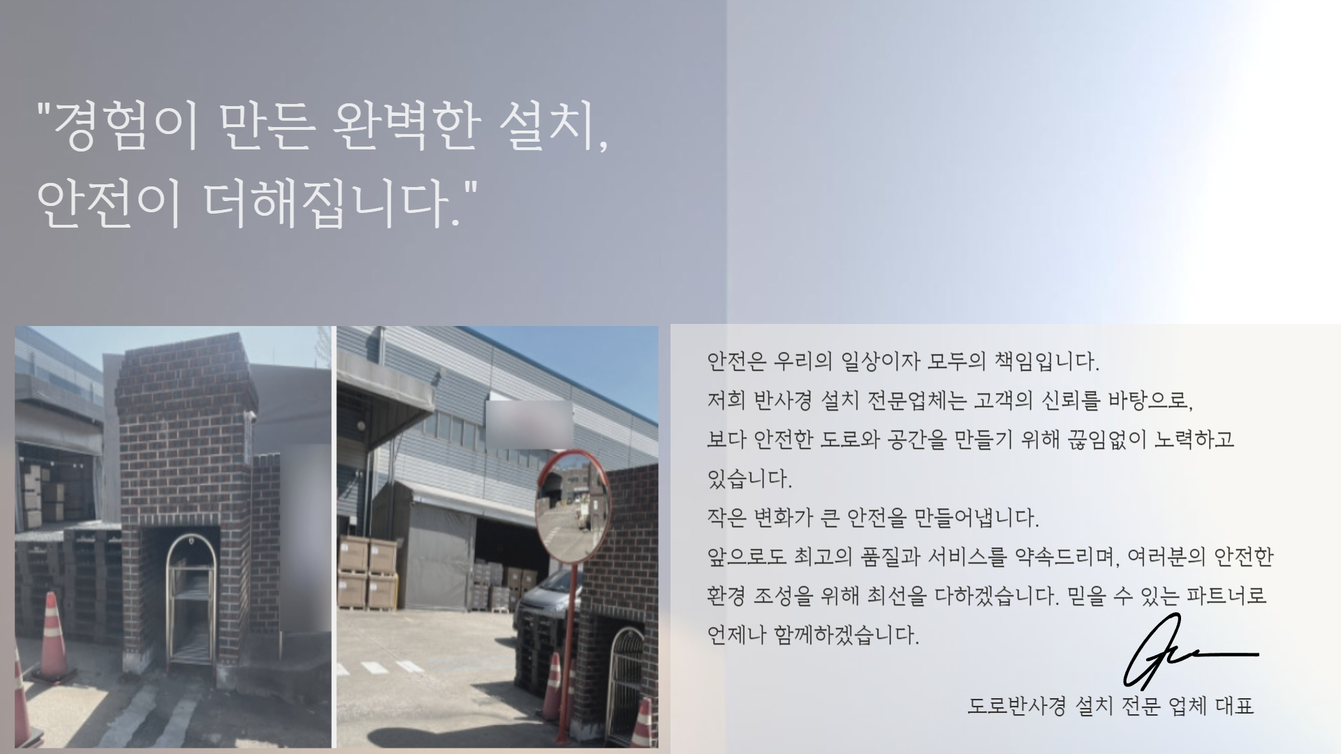 도로반사경설치 전문업체로서, 고객의 안전을 최우선으로 생각하며 신뢰와 품질을 바탕으로 최고의 서비스를 제공합니다.